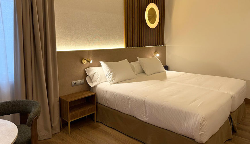 Funcional y luminosa habitación de 21 m2 totalmente reformada, bien equipada con todos los detalles de un hotel de 4 estrellas. La habitación doble Olid cuenta con cama de matrimonio o dos camas individuales, un completo cuarto de baño y un recibidor independiente de la habitación.